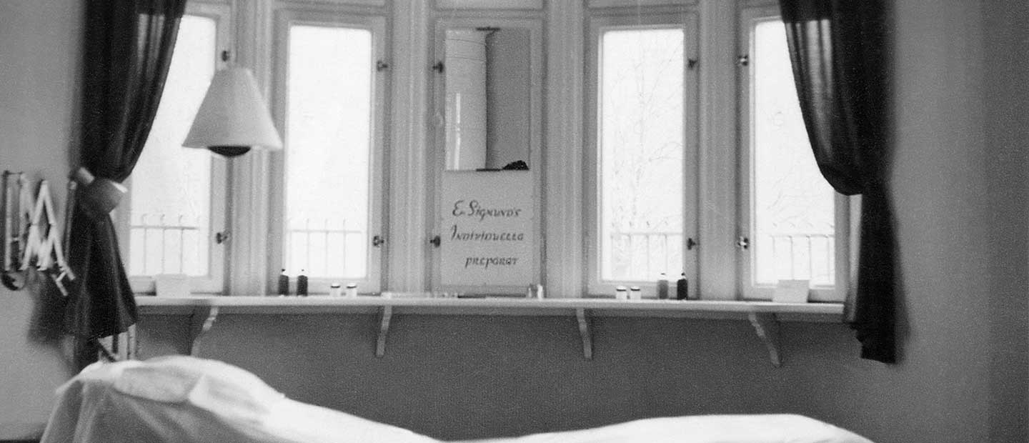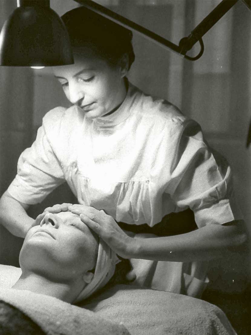 Das Foto zeigt Elisabeth Sigmund bei der Arbeit in ihrem „Salong för Skönhetsvård“ in Stockholm – ihrem „Salon für die Schönheitspflege“. Nachdem Sigmund viele Bücher über Heilpflanzen studiert hatte, brachte sie hier ihre eigene Kosmetik zur Wirkung. Anfangs rührte Sigmund für jede Kundin eine ganz individuelle Creme an, später schuf sie ein festes Sortiment an Pflegeprodukten. Was Sigmund glücklich machte? Wenn sie sah, dass die Haut einer Kundin wirklich besser wurde, Unreinheiten verschwanden – alles dank der Kraft der Heilpflanzen in ihrer Kosmetik. Dabei stellte sie fest: Die achtsame Berührung mit den Händen trägt zu einer guten Behandlung bei. Zusätzlich ermunterte Sigmund ihre Kundinnen, sich schöne Gedanken zu machen. Eine wundervolle Idee, oder?
