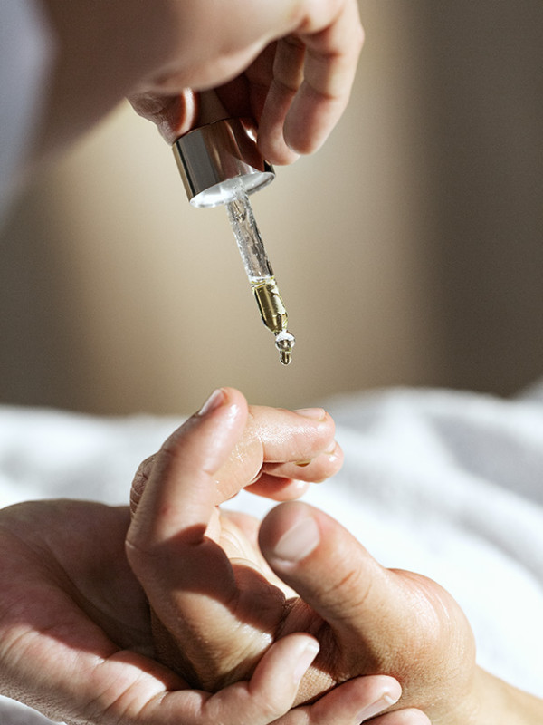Wir arbeiten bei der Körperbehandlung nicht schnell, sondern langsam. Die Körperteile, die ich behandele, decke ich auf, die anderen sind zugedeckt. Ich setze nur wenig Dr. Hauschka Pflegeöl ein. Nicht aus Sparsamkeit, sondern damit die Hände mit dem Gewebe in Kontakt bleiben. Bei einer ayurvedischen Behandlung mit viel Öl gleiten die Hände über die Haut, ohne Kontakt mit dem Gewebe aufnehmen zu können. Nehme ich wenig Öl, kann ich das Gewebe noch mitnehmen und kann etwas bewegen. Als ich in der Weiterbildung in den Dr. Hauschka Körperbehandlungen war, habe ich sogar eine Behandlung mal nur mit Dr. Hauschka Seidenpuder gemacht, weil es darum ging, nicht nur oberflächig über das Gewebe zu gleiten, sondern wirklich über die Hände zu atmen. Aber das ist nicht die Regel, natürlich setzen wir Dr. Hauschka Pflegeöle ein.